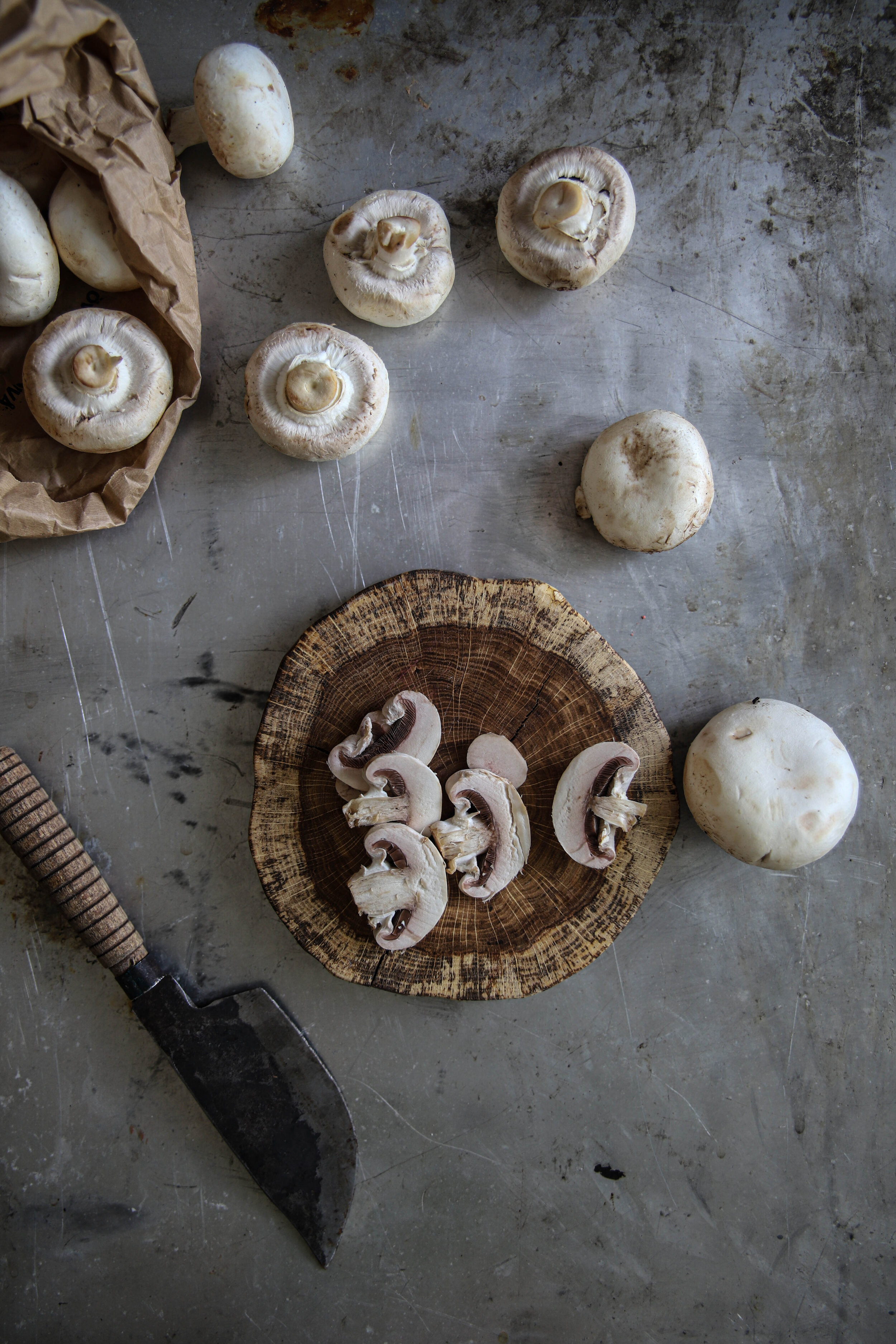3. Skär de två sparade champinjonerna i tunna skivor.